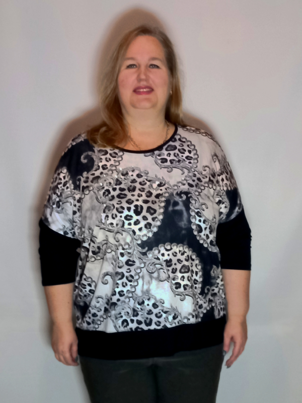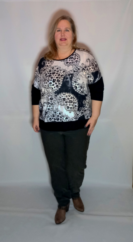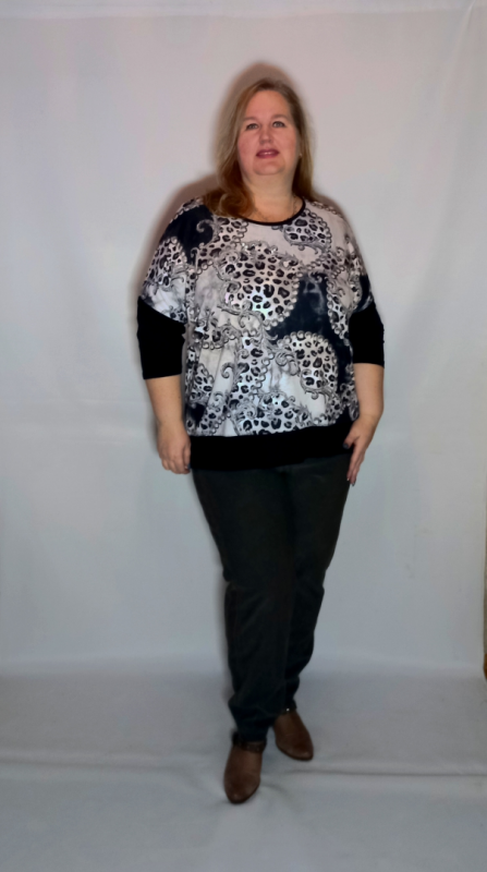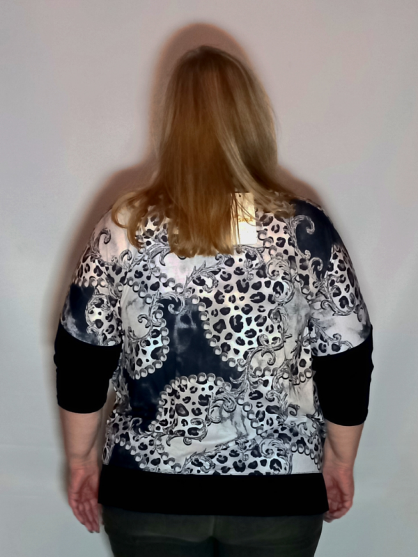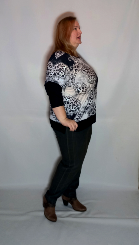Рукав 3/4, спущенное плечо, нижняя часть из однотонного трикотажа.