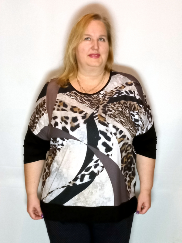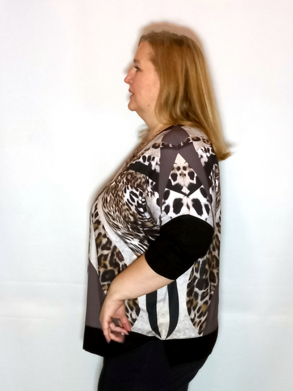 Рукав 3/4, спущенное плечо, нижняя часть из однотонного трикотажа.
