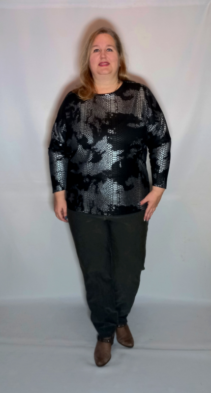 Трендовая туника выполнена из трикотажного полотна имитирующего кожу.