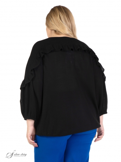 Оригинальный джемпер, свободного силуэта, выполнен из фактурного однотонного трикотажного полотна. Горловина У-образной формы. Модель с просторным рукавом длиной за локоть. Низ рукава, как и низ изделия, обработан эластичной тесьмой. На полочке и спинке расположена единая кокетка, переходящая на рукав. Линия кокетки подчеркнута элегантной рюшкой. Модель отлично скрывает проблемные зоны, а эффектный дизайн позволит чувствовать комфортно и стильно.