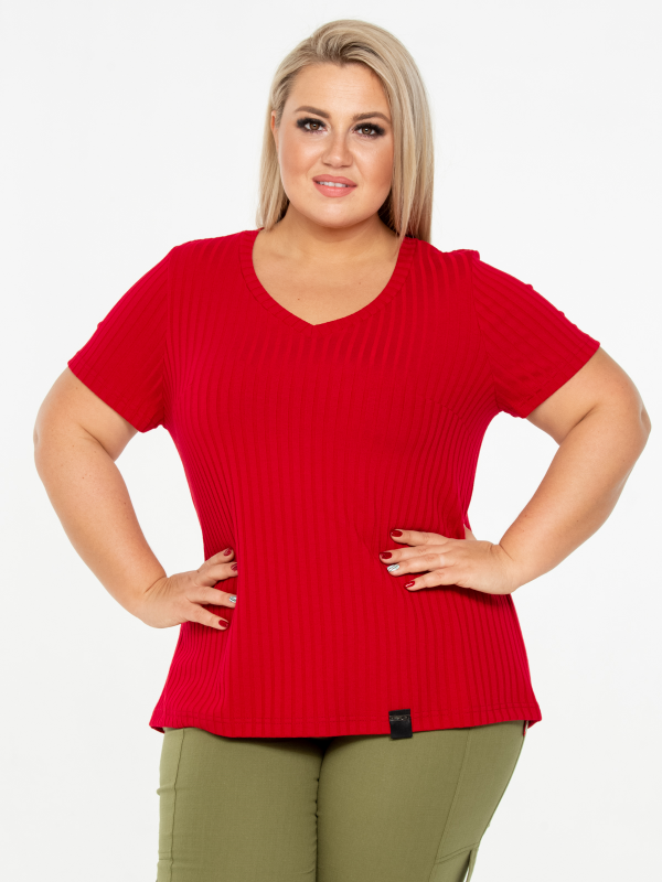 Вырез горловины V-образный, который эффектно подчеркивает шею и визуально удлиняет её.