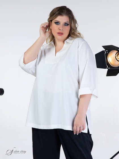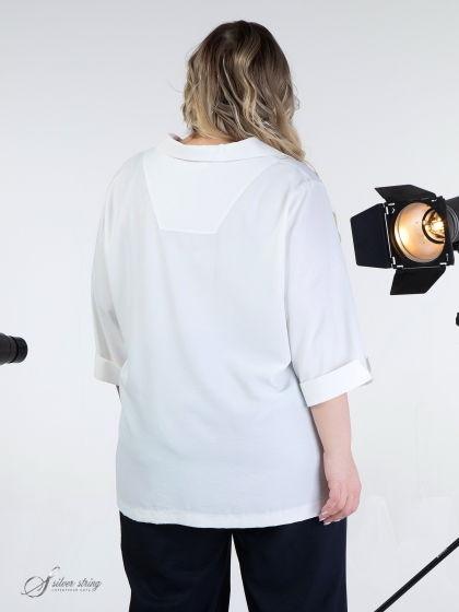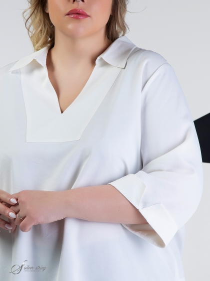 Эффектная блуза прямого силуэта с втачным рукавом длиной 3/4. Модель выполнена из шелковистой смесовой ткани с натуральным волокном. Материал обладает легким «крэш» - эффектом. Низ рукава обработан притачным отворотом. Модель с У-образным вырезом, без застежки. Воротник рубашечный, на стойке. На полочке и спинке расположены накладные кокетки трапециевидной формы. В боковых швах обработаны разрезы. Такой крой отлично маскирует проблемные зоны, стройнит и вытягивает фигуру. Модель позволит чувствовать себя комфортно и уверенно.