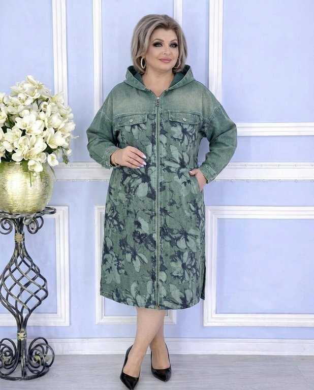 Кардиган выполнен из классической джинсовой ткани. СРедняя плотность, приятная, пластичная. В данной модели сочетаются ткани компаньоны- однотон и принтованная.