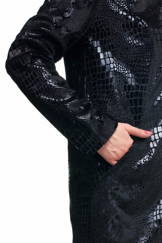 Эффектная стильная удлинённая куртка из прочной ткани с рельефным мерцающим принтом, имитирующим кожу рептилий.